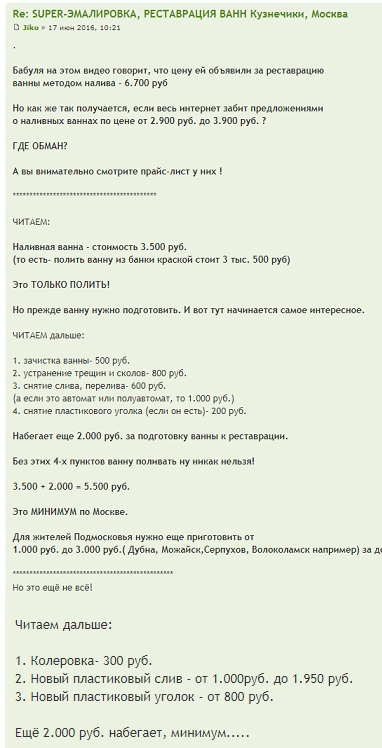 Jiko Опубликовано 17 июня, 2018 Автор Опубликовано 17 июня, 2018 .А я об этой афере ещё 2 года назад везде всех предупреждал!Ровно 2 года назад, 17 июня 2016 года, писал на всех форумах.Вот доказательство: http://www.podolsk24.net/forum/viewtopic.p...50&start=90http://forumklimovsk.0pk.ru/viewtopic.php?id=363&p=4 Они ВСЕ и на своих сайтах прописывают эту минимальную сумму, и диспетчер потелефону, при приёме заказа- тоже озвучивает её же.Главное заманить клиента . А уже на месте, когда реставрация завершена- начинается самое интересное!Вам показывают "ПРАЙС-ЛИСТ", где сумма за эту услугу значительно больше. Вы звоните на фирму, а там говорят:- Надо было внимательнее читать на нашем сайте "ПРАЙС-ЛИСТ", мастер прав, стоимостьреставрации Вашей ванны не 3.500 руб., а 6.7000, 7.600 или 8.900 рублей..... .