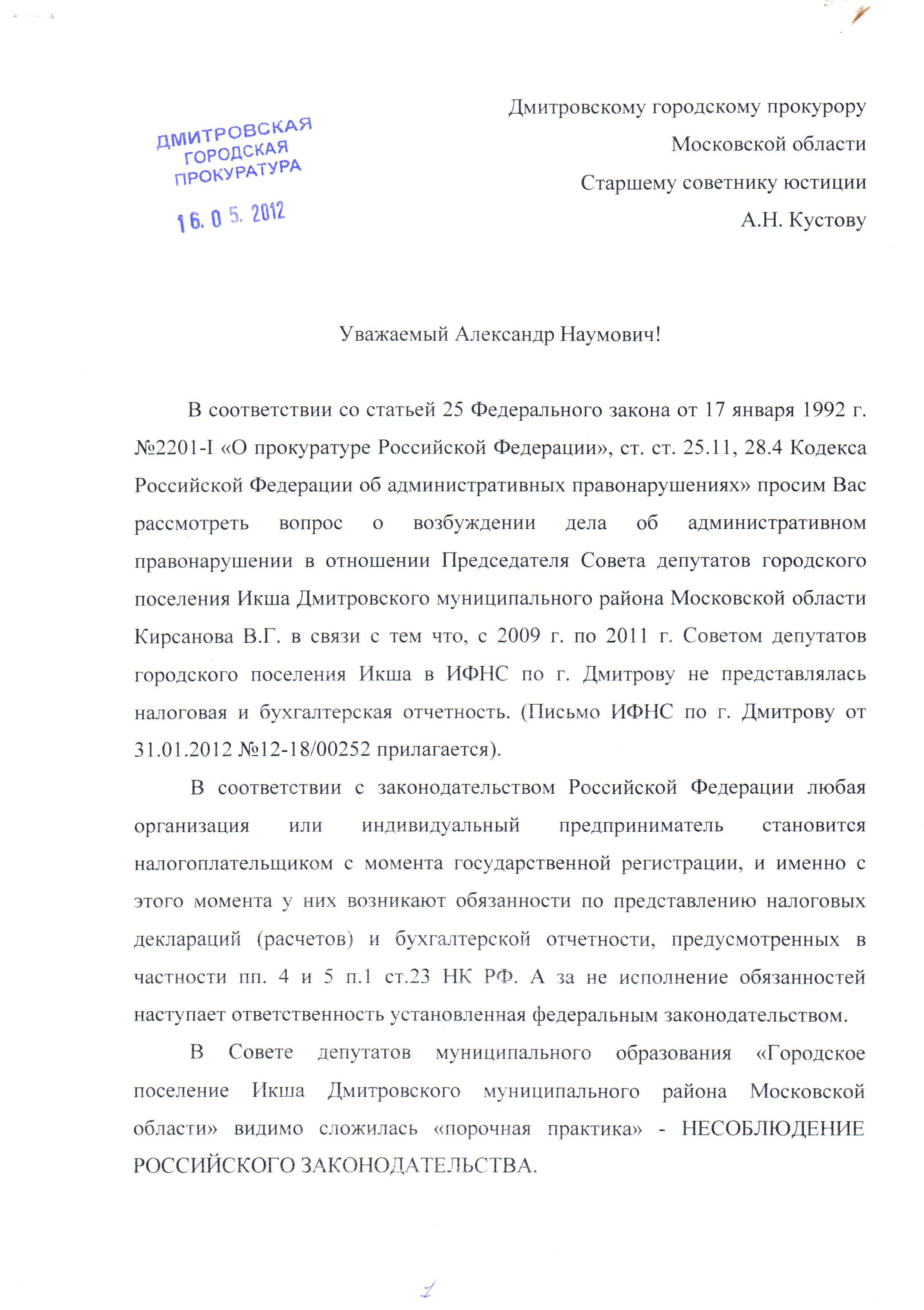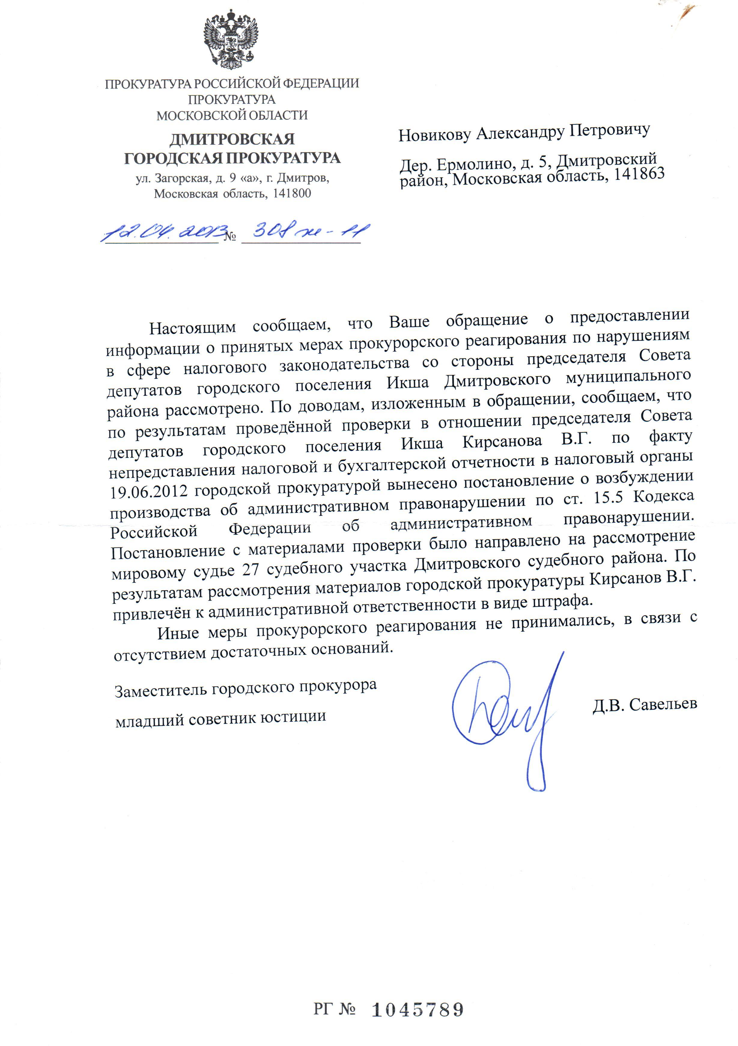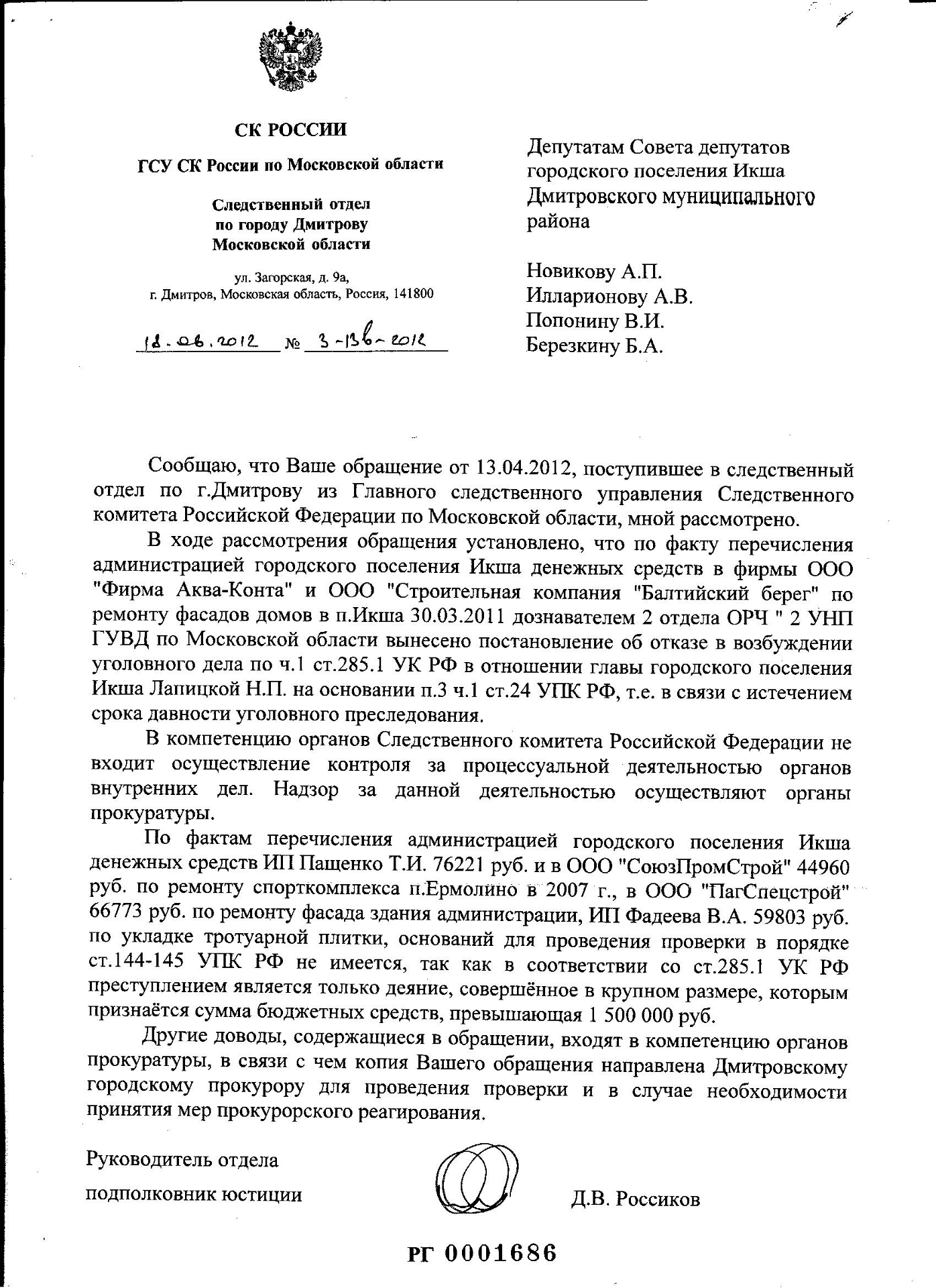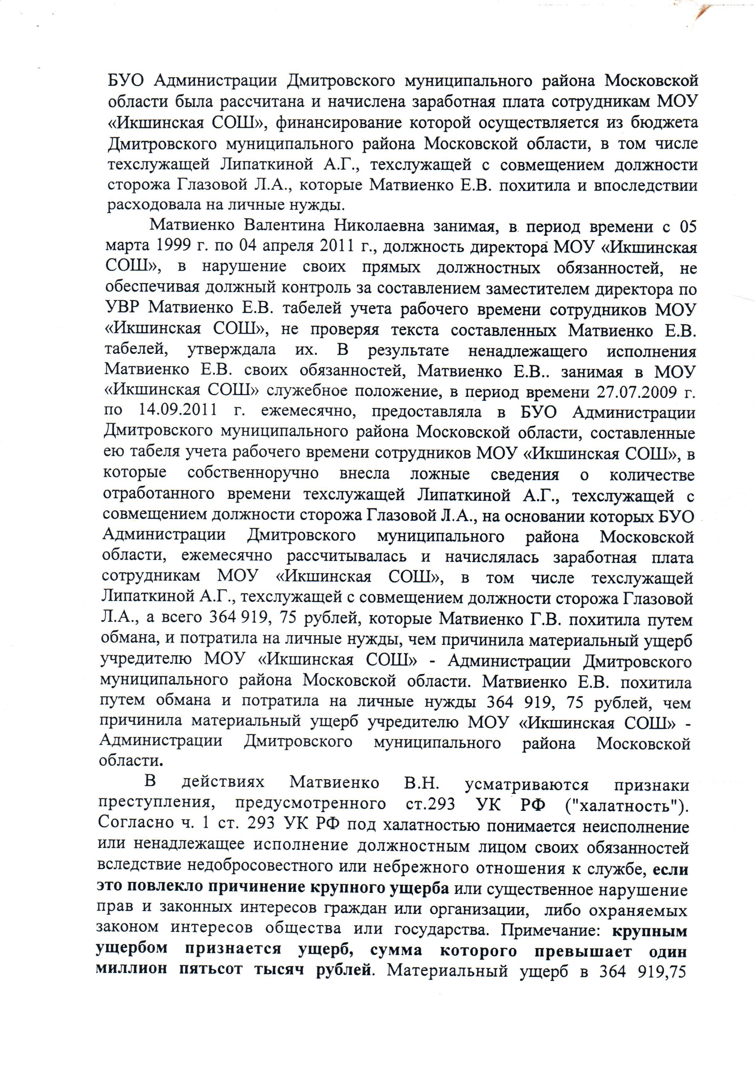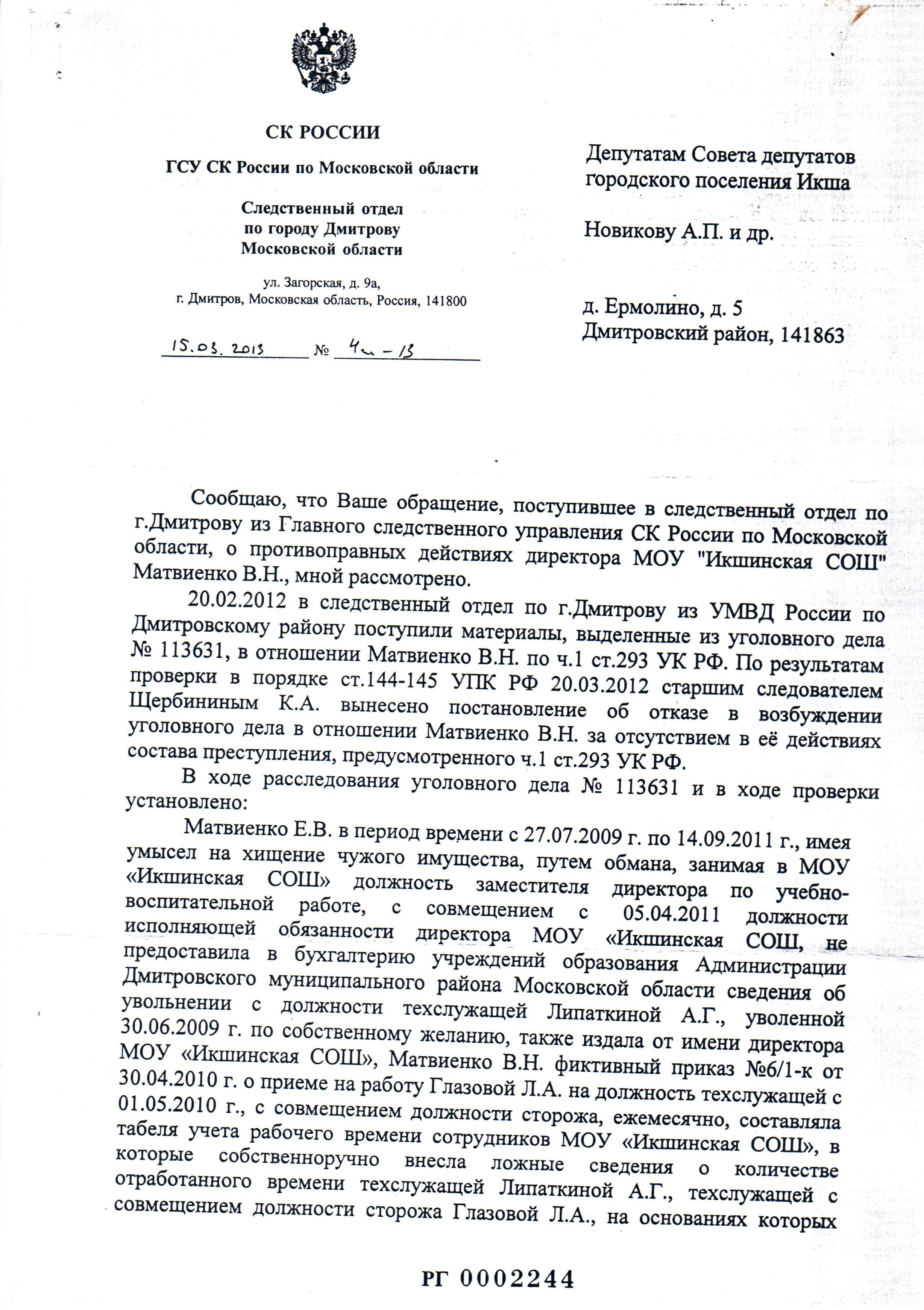 депутат Новиков А.П. Опубликовано 10 июля, 2016 Опубликовано 10 июля, 2016 Ранее было возбуждено уголовное дело на Лапицкую Н. П. в 2009г. Следственный комитет Дмитровского района в лице Д.В. Россикова дал ответ: отказ в возбуждении уголовного дела в связи с истечением срока давности, также пишет, преступлением является только даяние в крупном размере, которым признается сумма бюджетных средств свыше 1 500 000 руб., притом просто рядовой гражданин за кражу пакета картошки получает реальный срок!Привилегии удел богатых и чиновников. Решение следственного комитета - это начало переписки, которая продолжается по сей день...