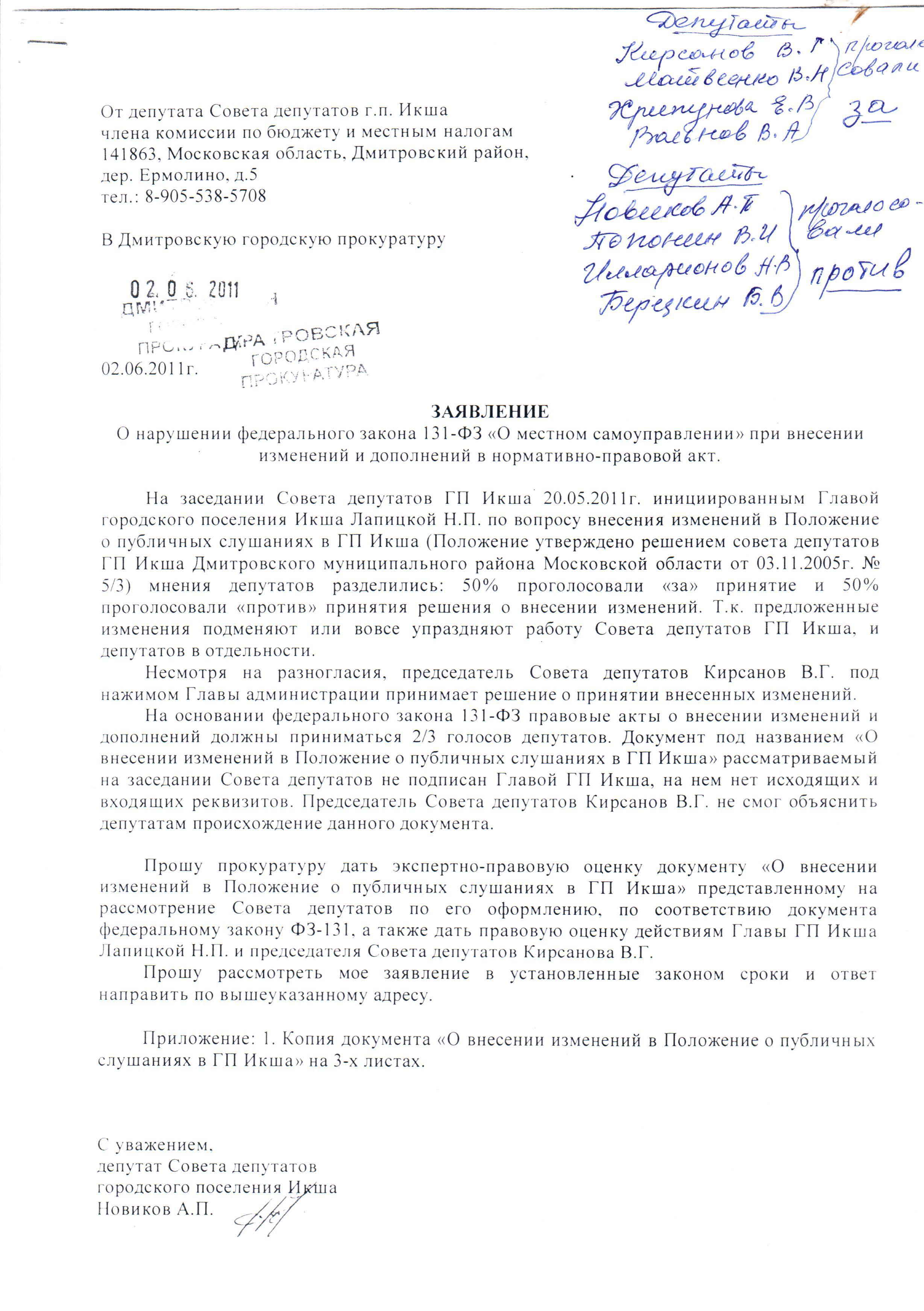 депутат Новиков А.П. Опубликовано 7 августа, 2013 Опубликовано 7 августа, 2013 И все же, несмотря на это наши усилия оказались положительными. Поле стоит заросшее бурьяном, перелесками, логистика не строится, некоторое время было объявление о продажи прав на этот земельный участок. Публичные слушания согласно ФЗ №131 работают и не являются формальными.В подтверждение этого, срочно был вынесен проект решения на Совет депутатов городского поселения Икша, подготовленное администрацией о внесении изменений (публичных слушаний).Председатель совета депутатов В.Г. Кирсанов без вынесения этого вопроса на комиссию при четырех голосах «за» и при четырех «против» принял изменения в положение о публичных слушаниях с нарушением законодательства, передал все полномочия по публичным слушаниям главе г.п. Икша Н.П. Лапицкой, хотя это прерогатива Совета депутатов. В общем, одним махом обезличили Совет депутатов г.п. Икша. Осталось поднимать руки при голосовании за интересы главы администрации шести зависимых депутатов из десяти. В подтверждение публикую некоторые документы: Продолжение следует...